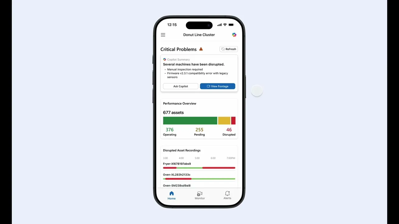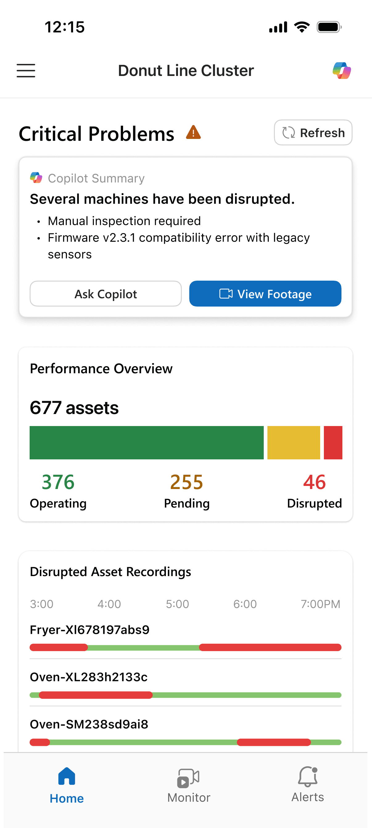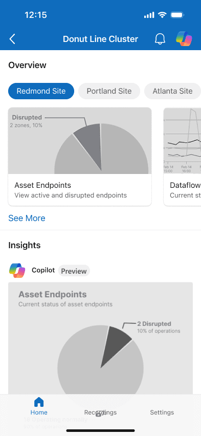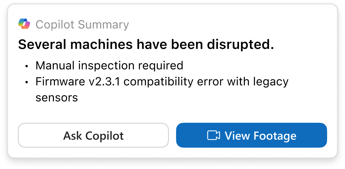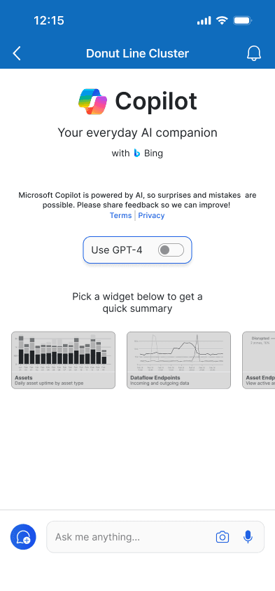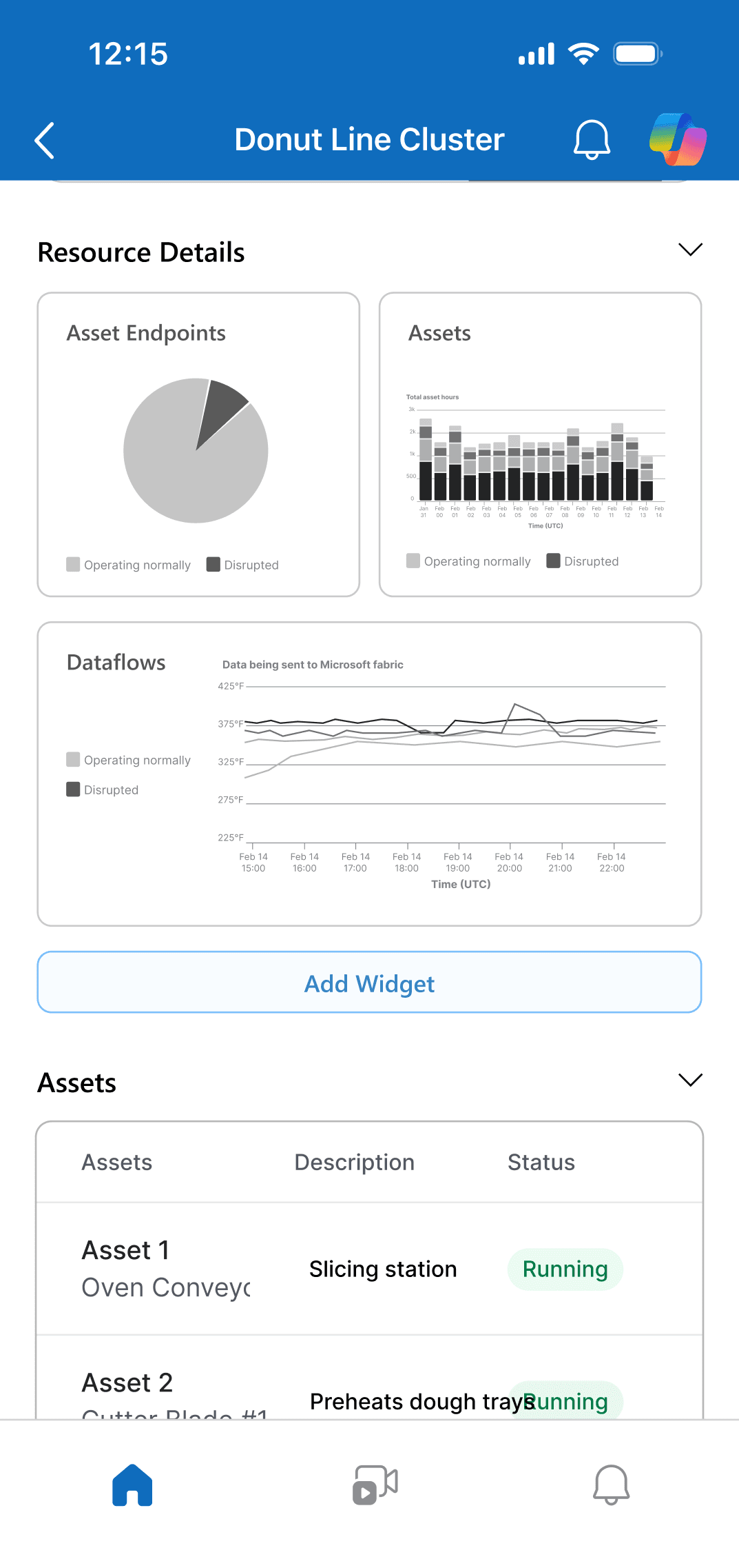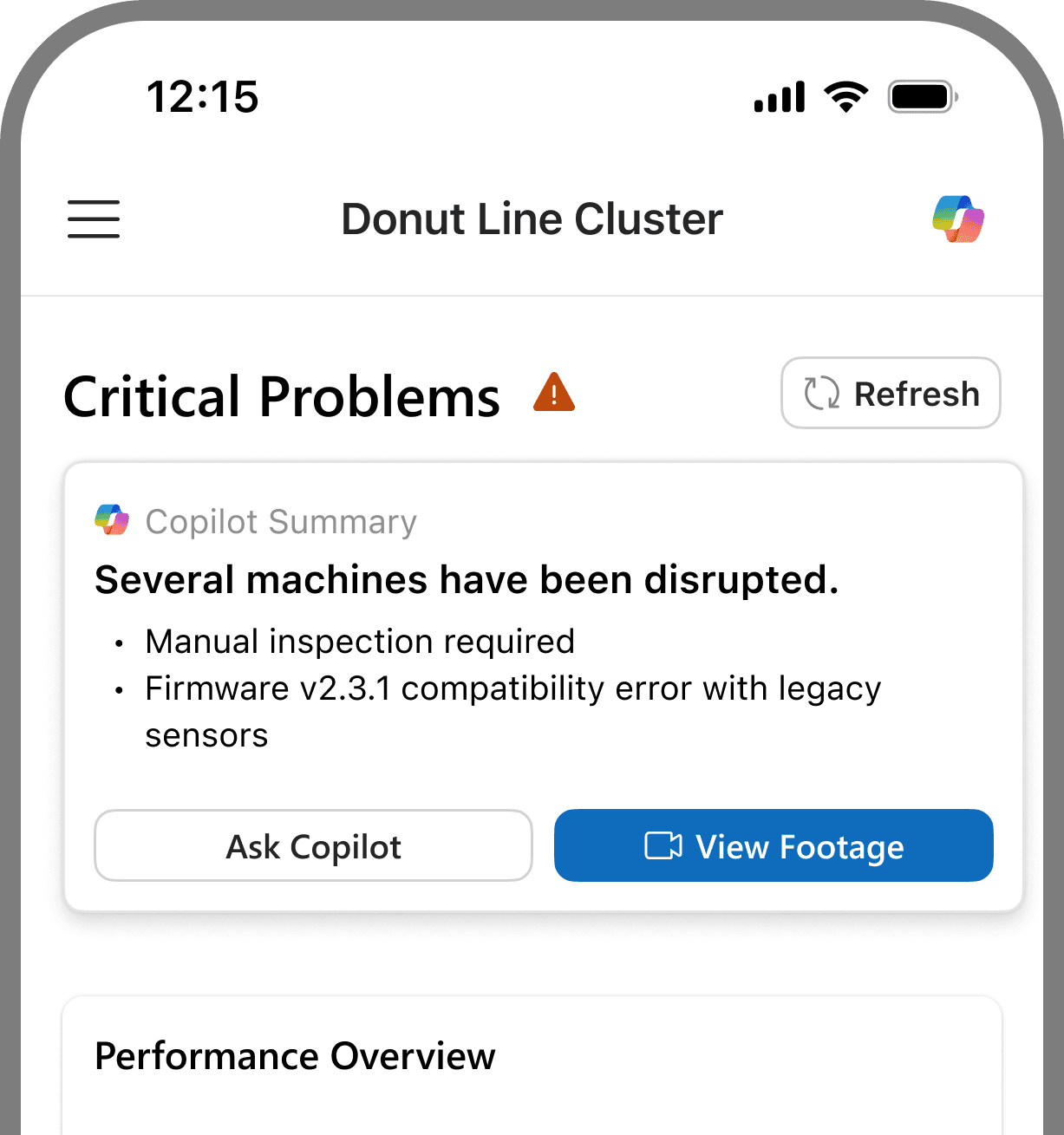 Mobile widgets show how each production line and asset is performing without overwhelming you with details. Copilot summaries at the top lets you understand system health in seconds, even while moving between locations.