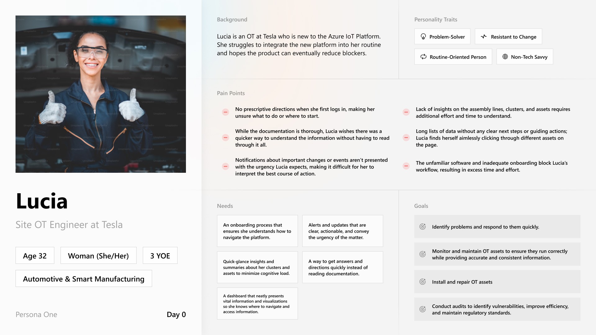 New to Azure IoT Platform that her company freshly adopted, Lucia struggles to integrate it into her routine. She wishes there was an easier and faster way to access urgent information.