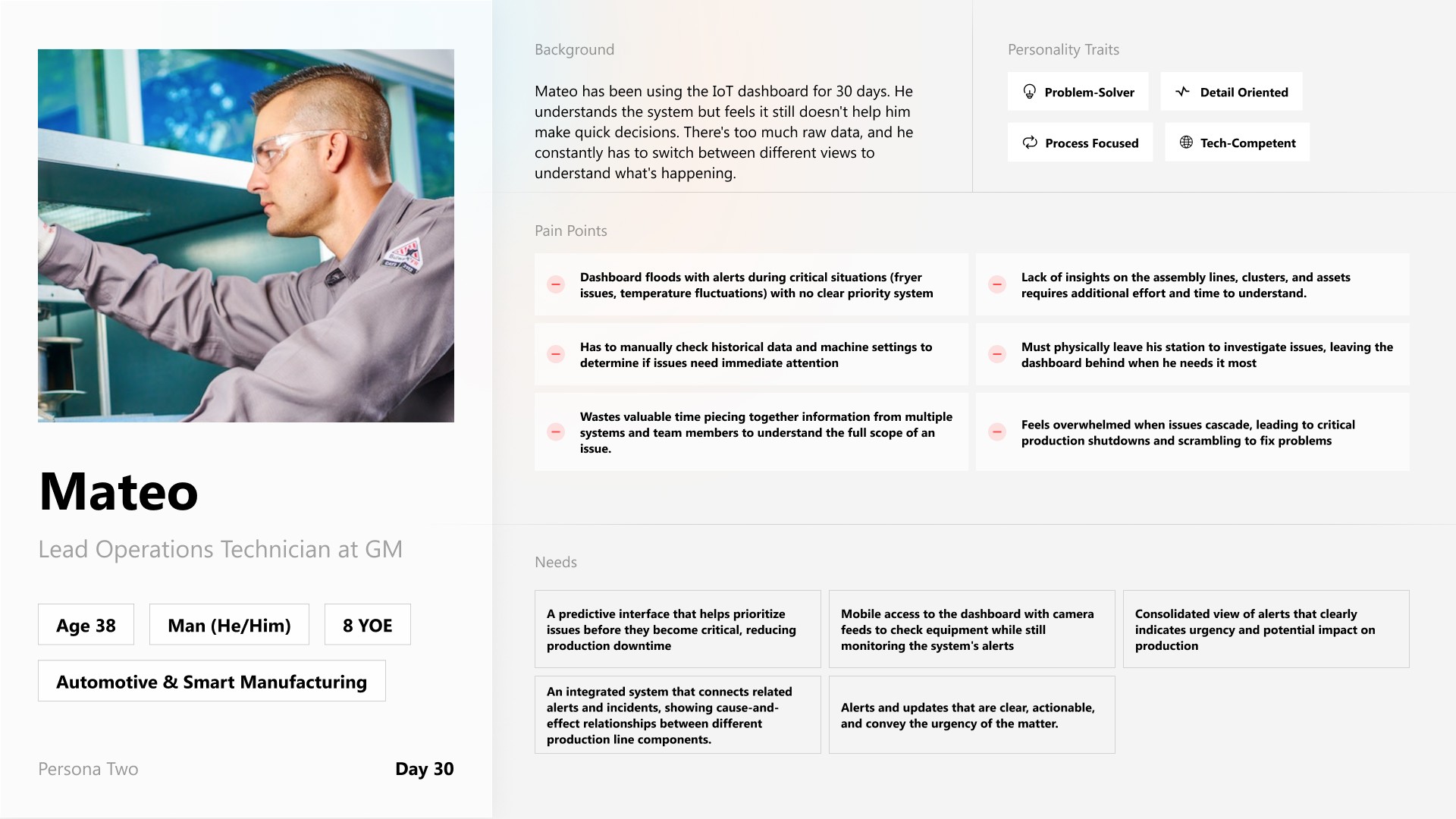 Azure IoT helps Operation Technicians manage production lines — think donut factories or automotive plants with hundreds of machines running simultaneously. The current experience? A flood of raw data with no clear priorities.