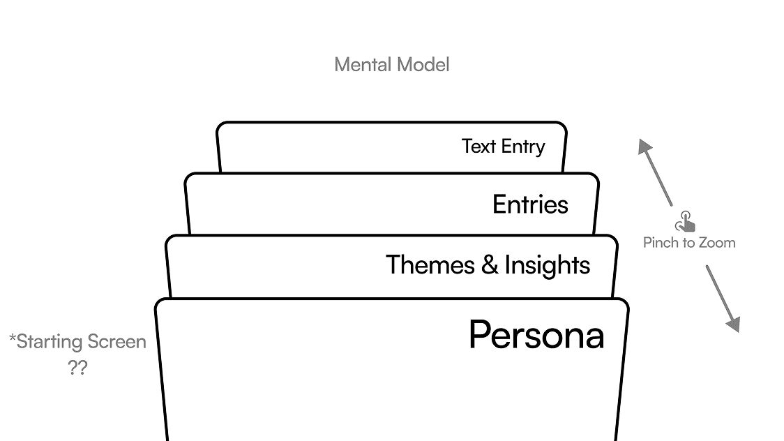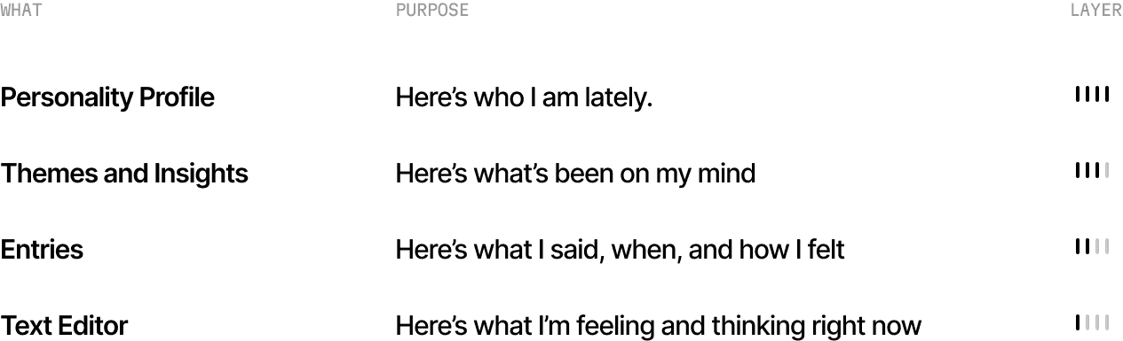 To hide clutter and keep users fully immersed on each layer, we decided to have a spatial zoom interaction to change tabs. This way, each layer feels like a “depth of self”: from the surface-level personality to the raw inner monologue: