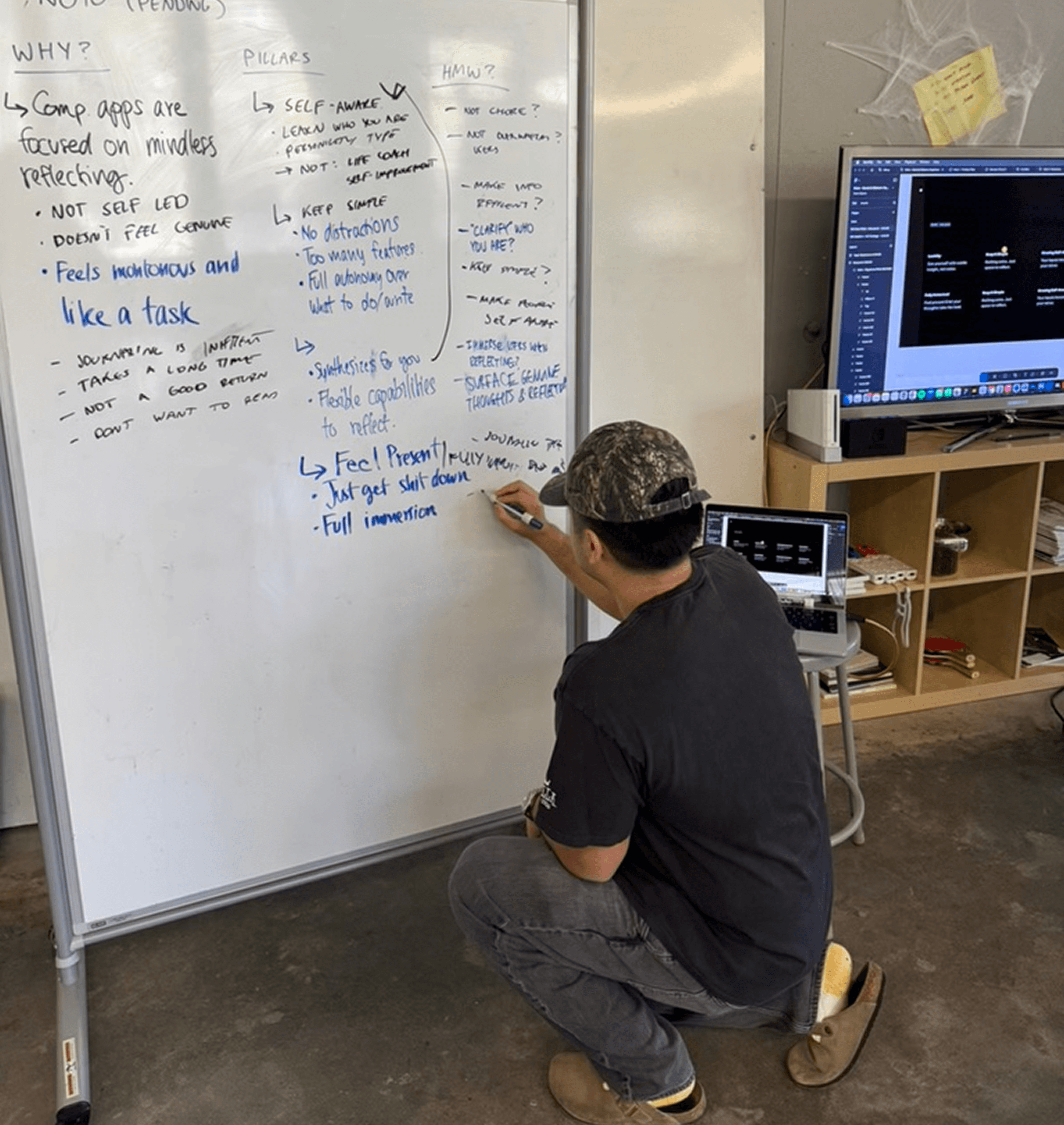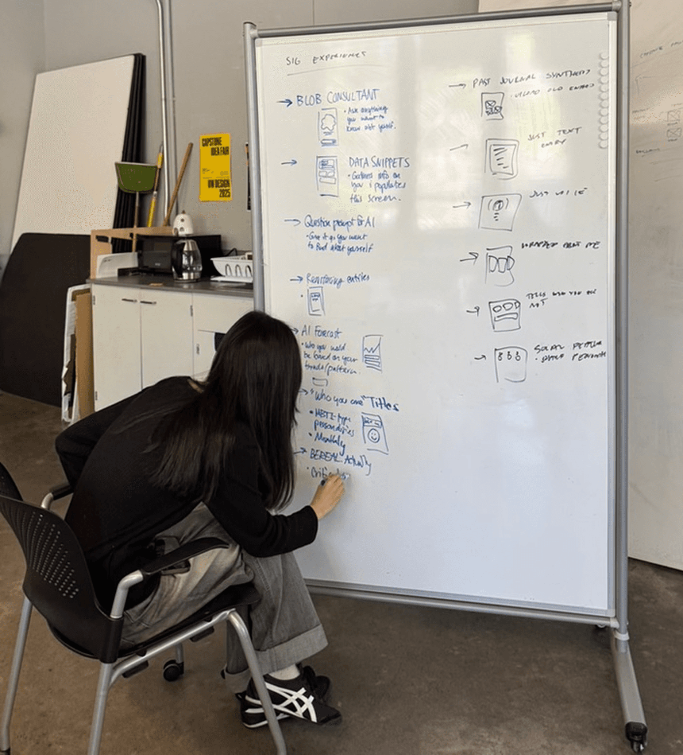 My teammate and I whiteboarded different ways to surface insights — from abstract, build-up visuals (dots tracking progress or patterns) to prescriptive snippets and direct feedback. This helped us realize that each idea held a different tone and that we wanted to evoke one that felt gentle, insightful, and never confining.