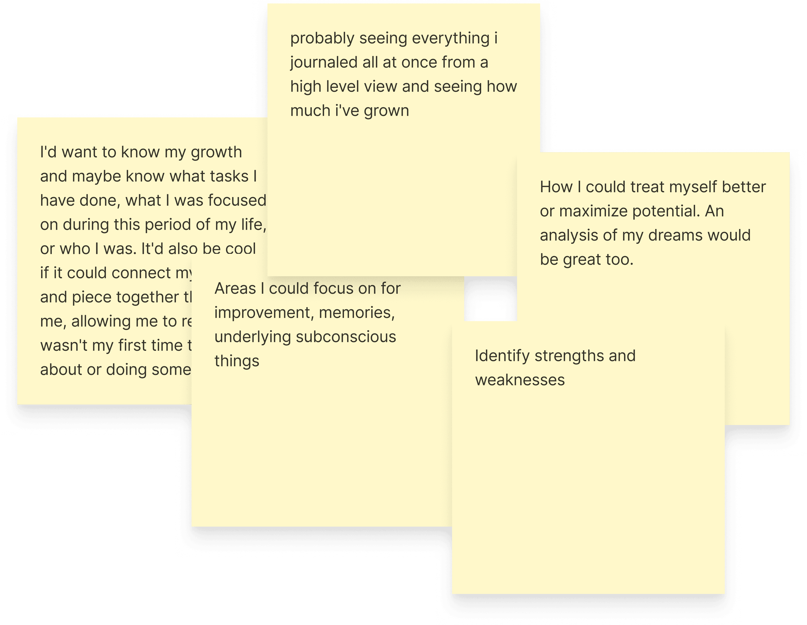 Most journaling apps approximate insight with mood sliders and surface-level stats. I wanted something more nuanced — using AI to read between the lines and pull meaning straight from the writing itself. The aim was to reveal patterns and reflections that feel genuinely tied to who the user is.