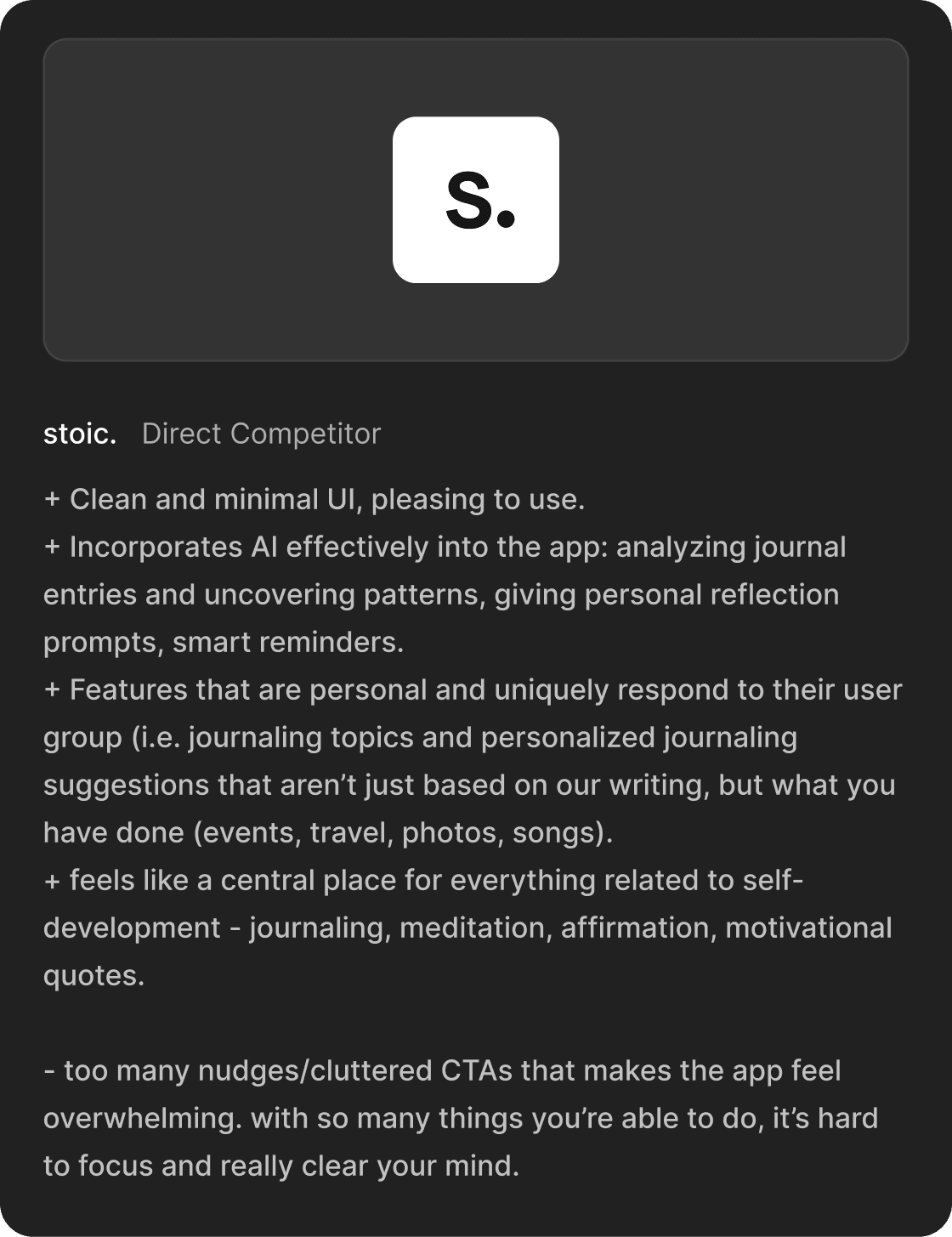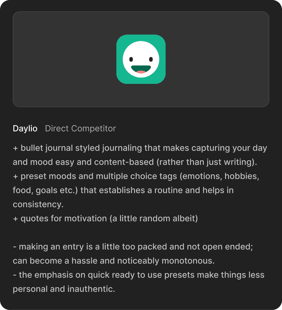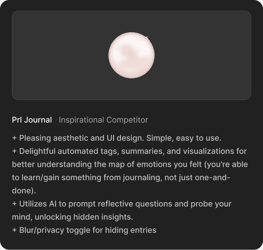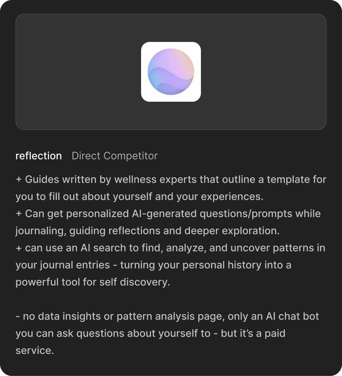 In addition to lacking meaningful self-insight, most competitor apps push engagement over genuine reflection. I wanted to create a space where insights emerge naturally, not because users are trying to hit a quota.