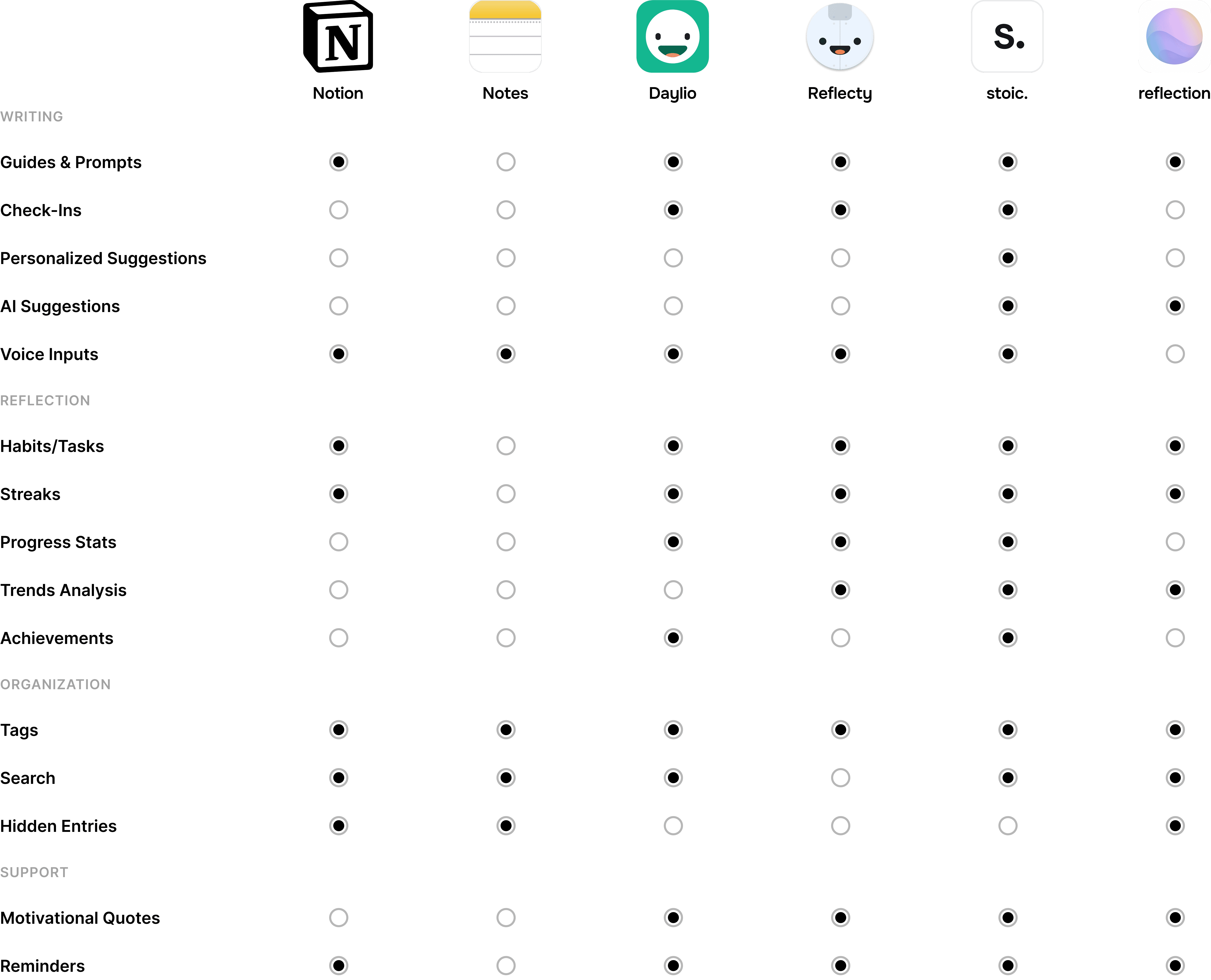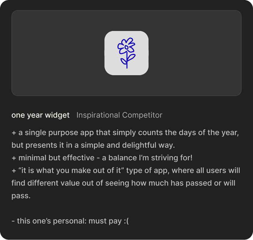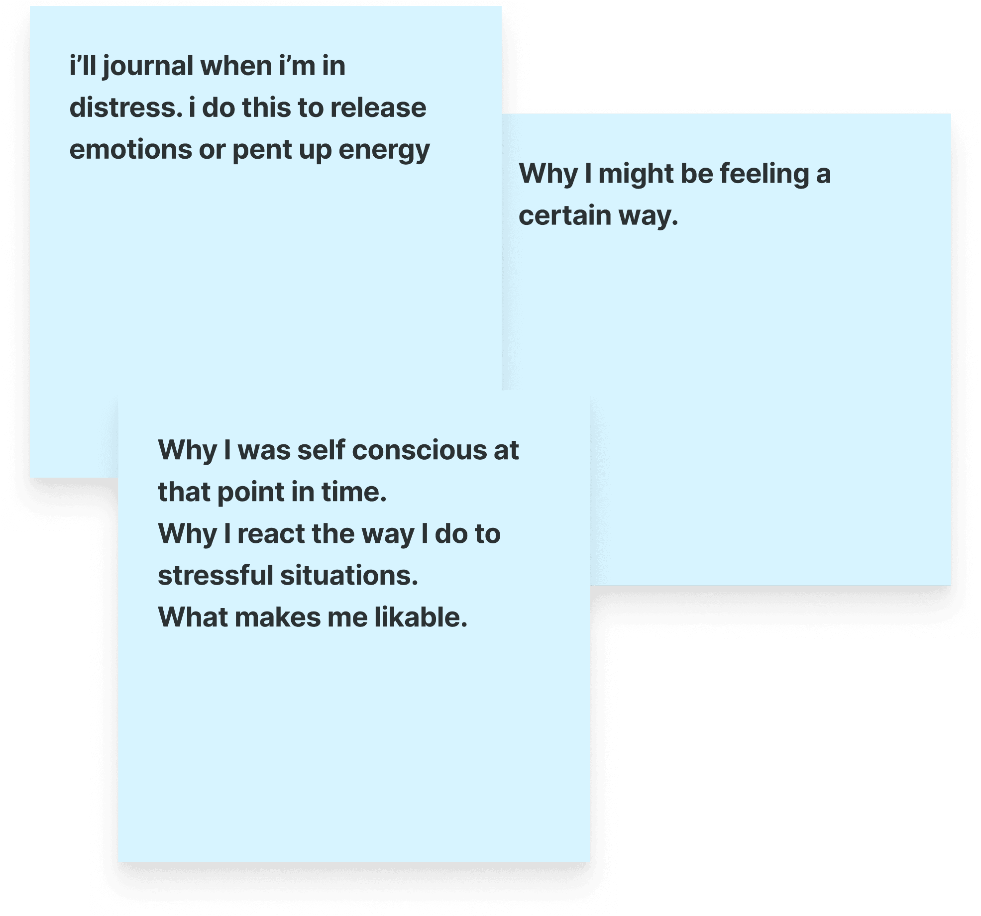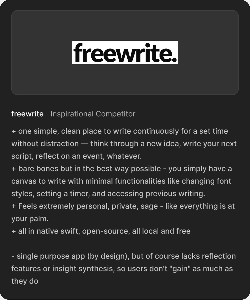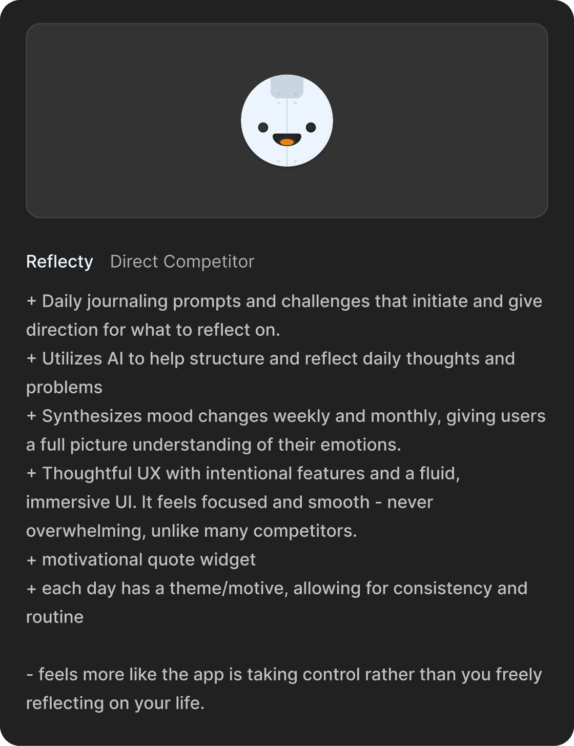 In addition to lacking meaningful self-insight, most competitor apps push engagement over genuine reflection. I wanted to create a space where insights emerge naturally, not because users are trying to hit a quota.