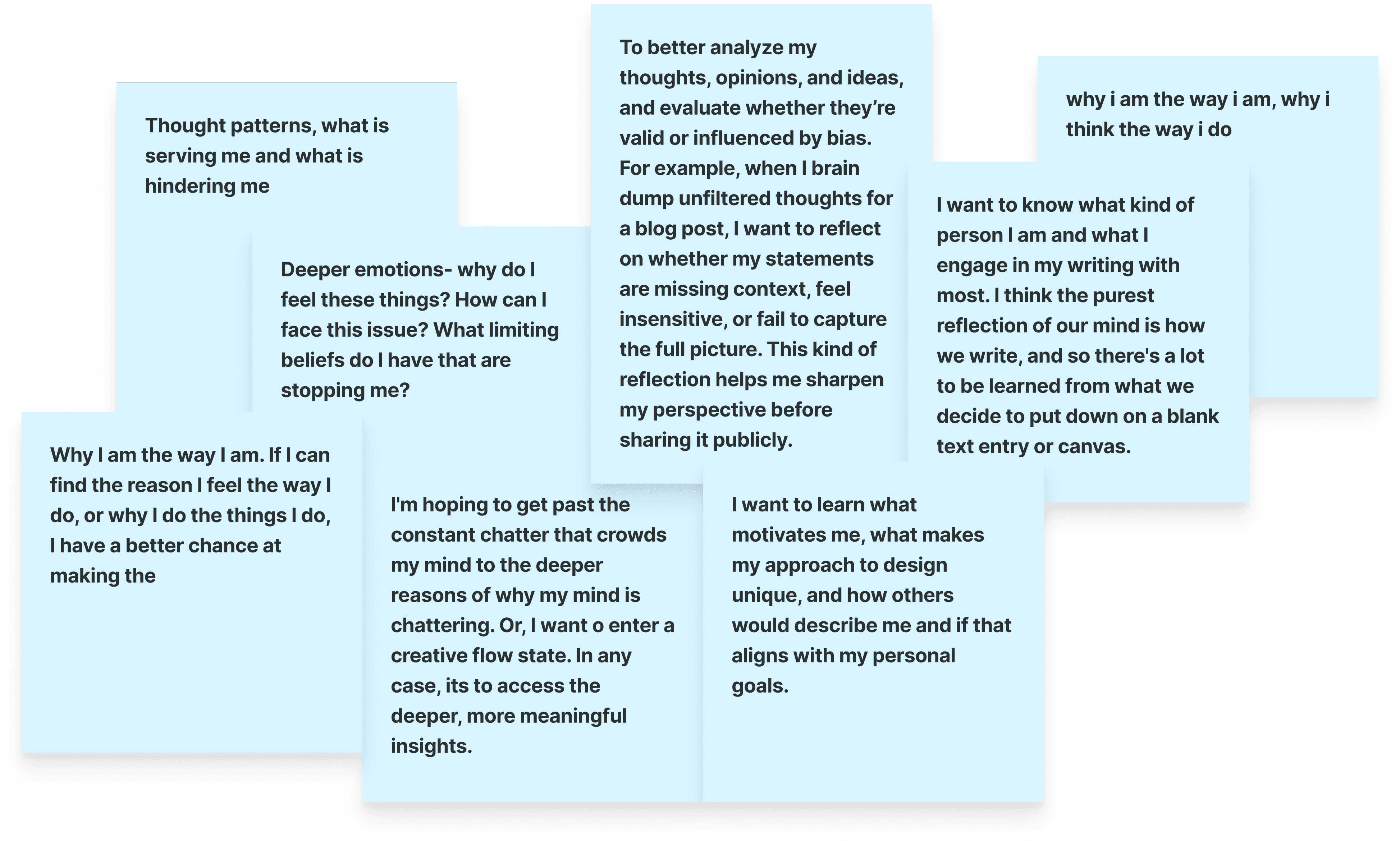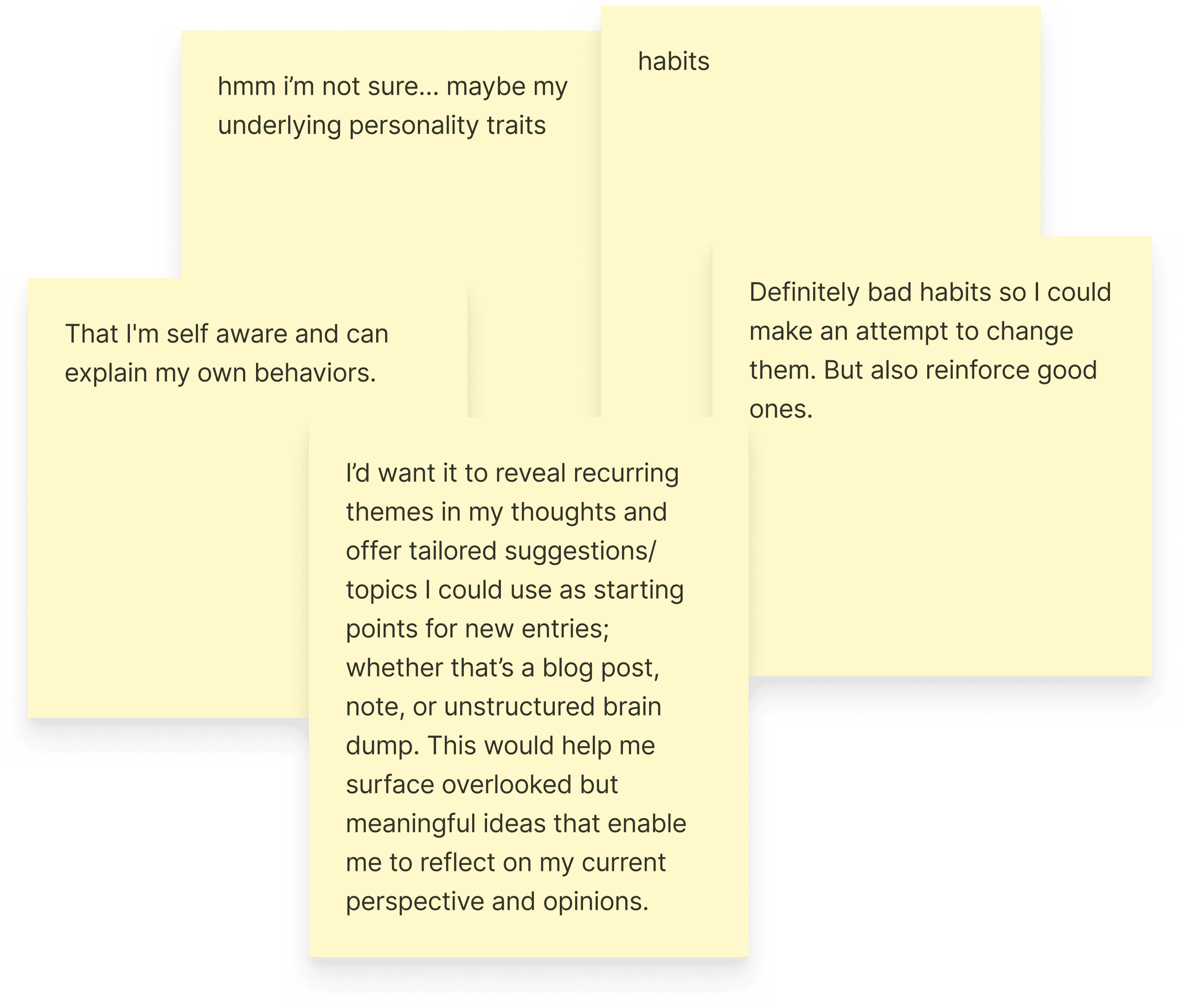 Nuanced things like recurring thoughts or how they've shifted over time. Something that gives back, not just takes input.
